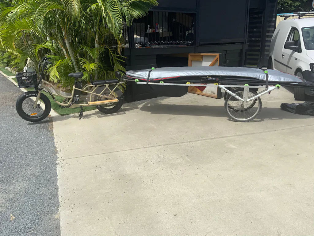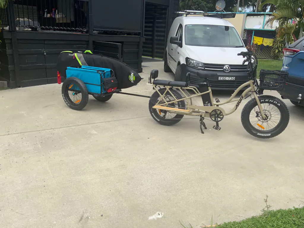 This is one of key differences between the Higgs Cargo and the Alpha Cargo. The Higgs Cargo has a smaller frame with 20"x4" fat tyres and an extended wheel base for a lower center of gravity and overall balance.